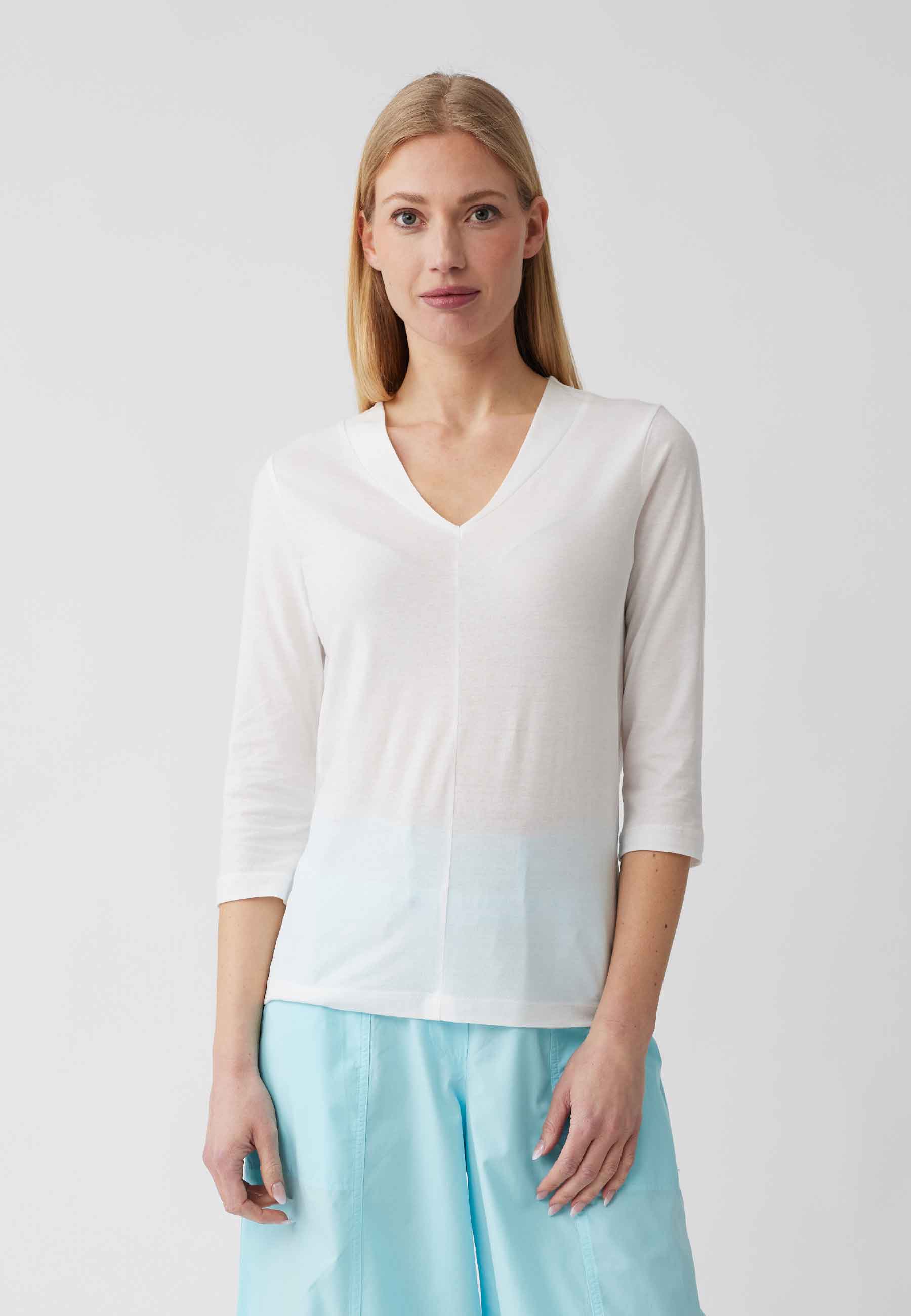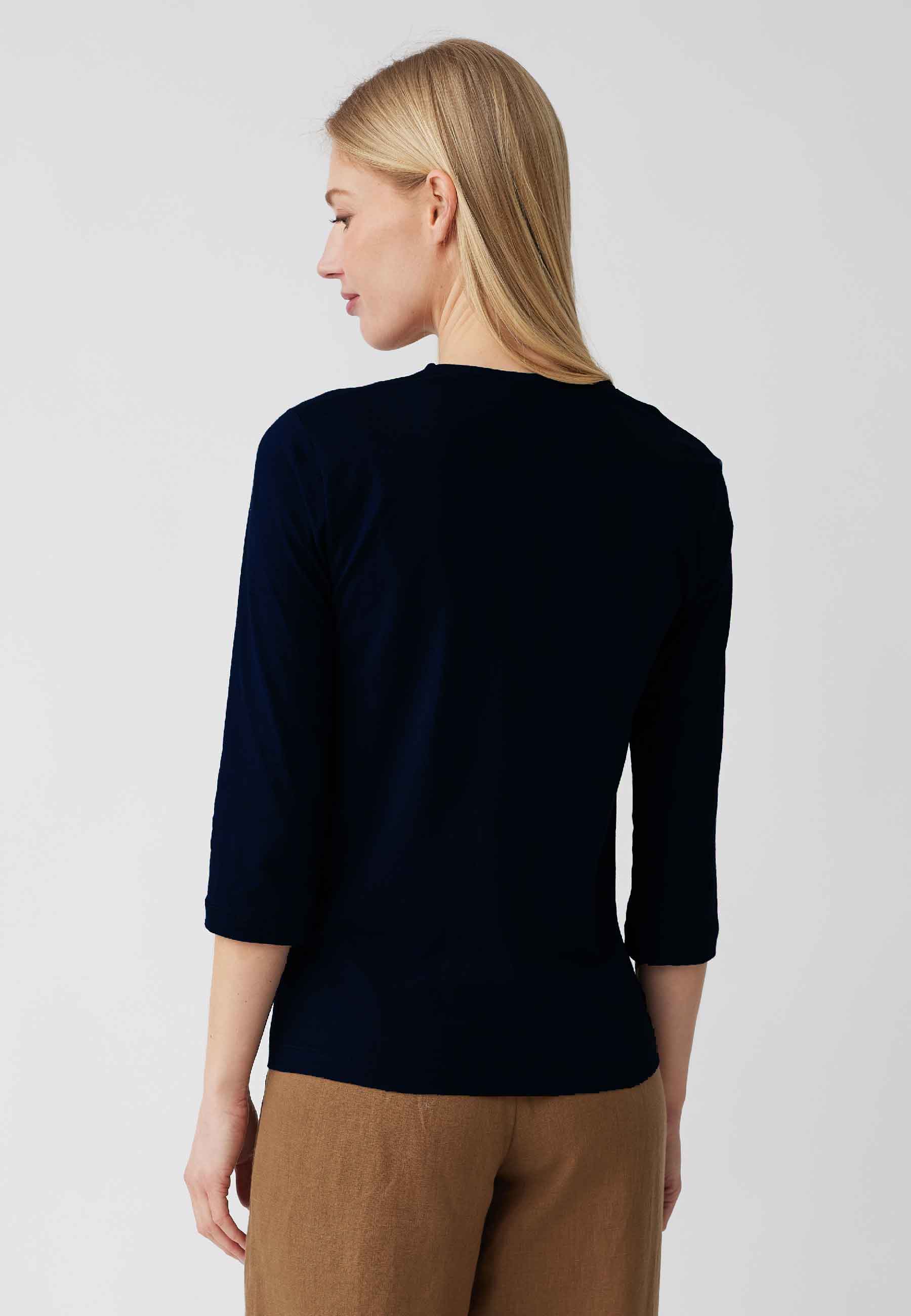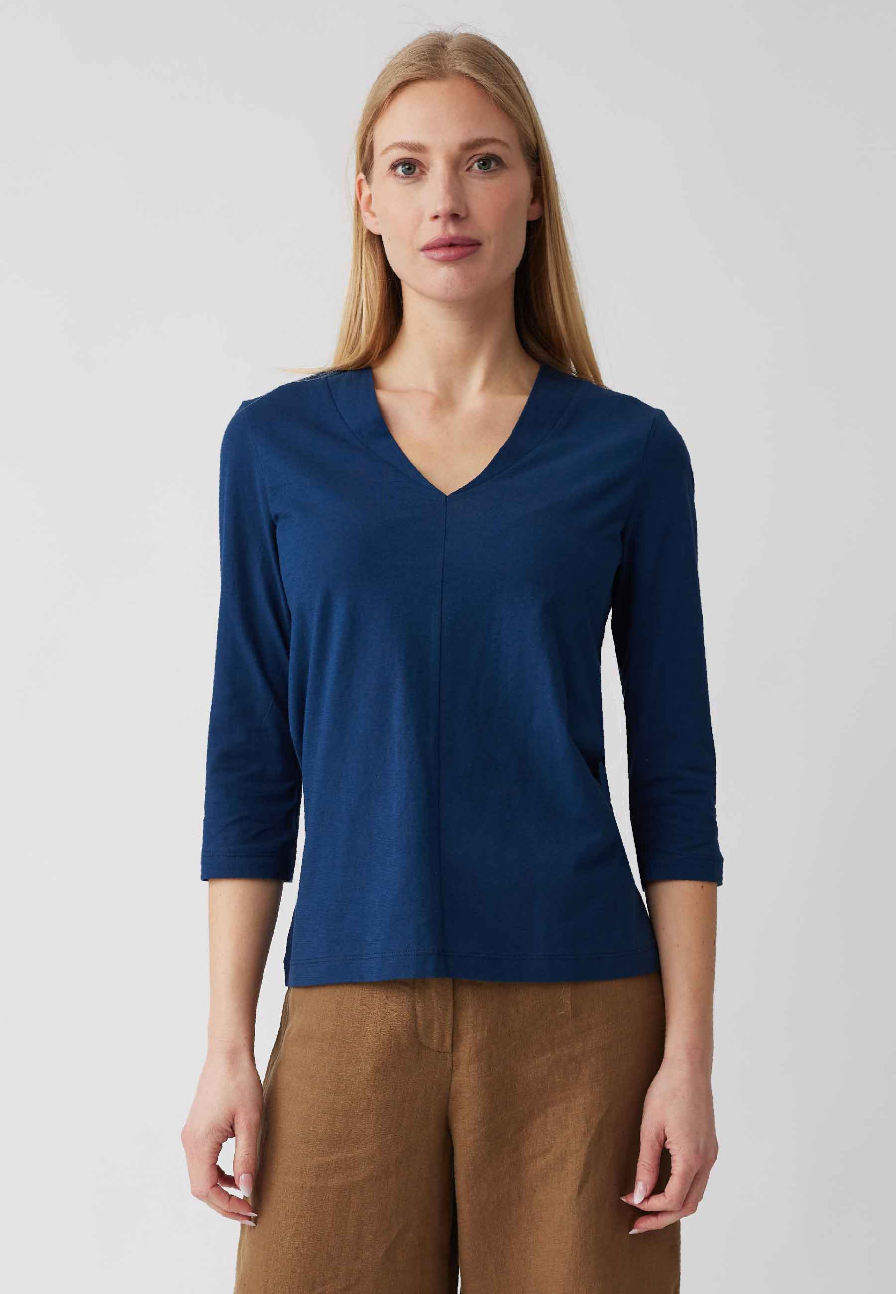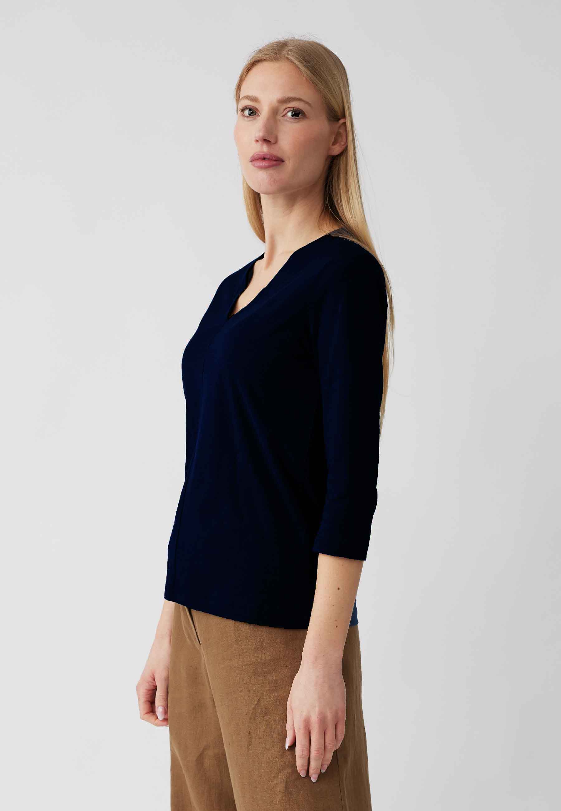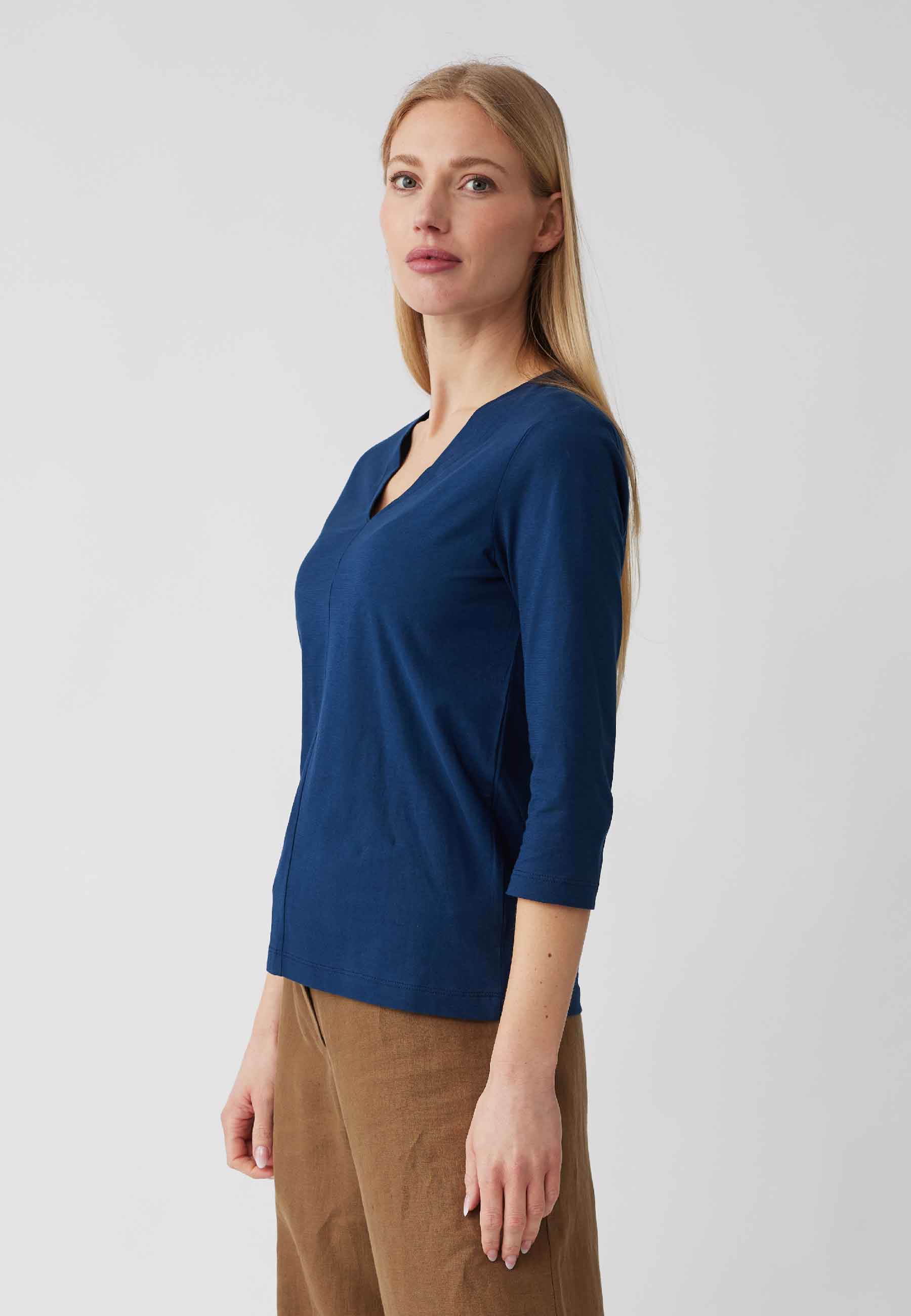 Shirt ALMILA aus leichter Bio-Baumwolle besticht durch seinen Außergewöhnlichen V-Ausschnitt, der fast schon die Anmutung eines kleinen Kragens hat und im Vorderteil in eine streckende Naht übergeht. Eine schmale, körpernahe Passform und die ¾ langen Ärmel runden das Design perfekt ab.