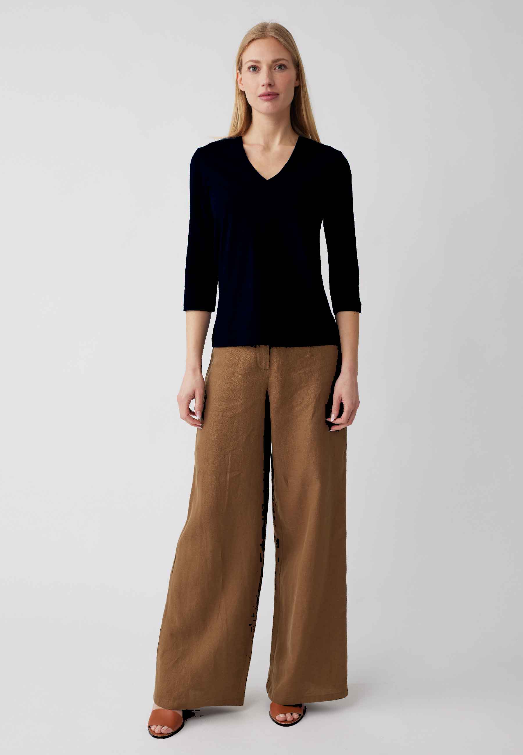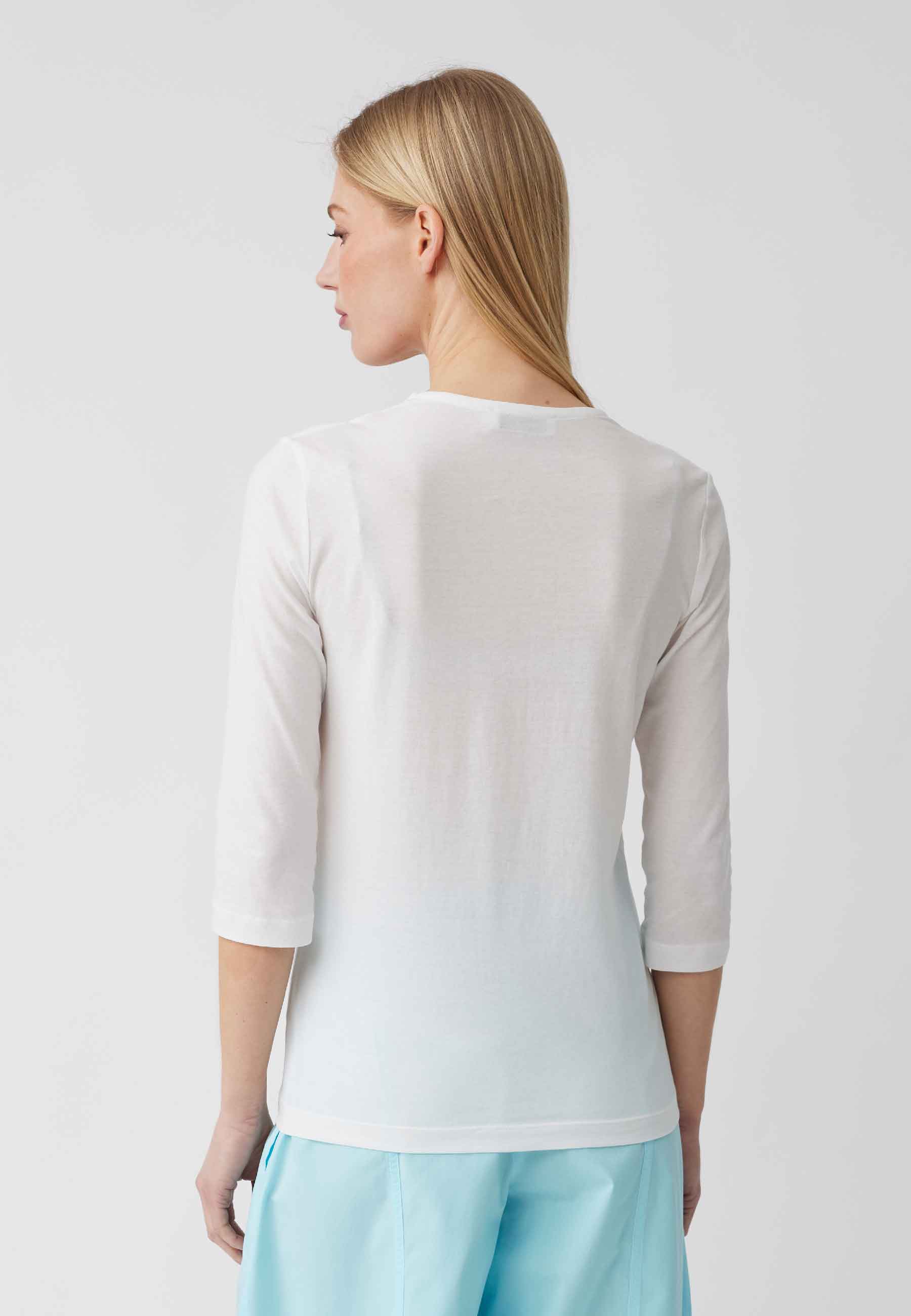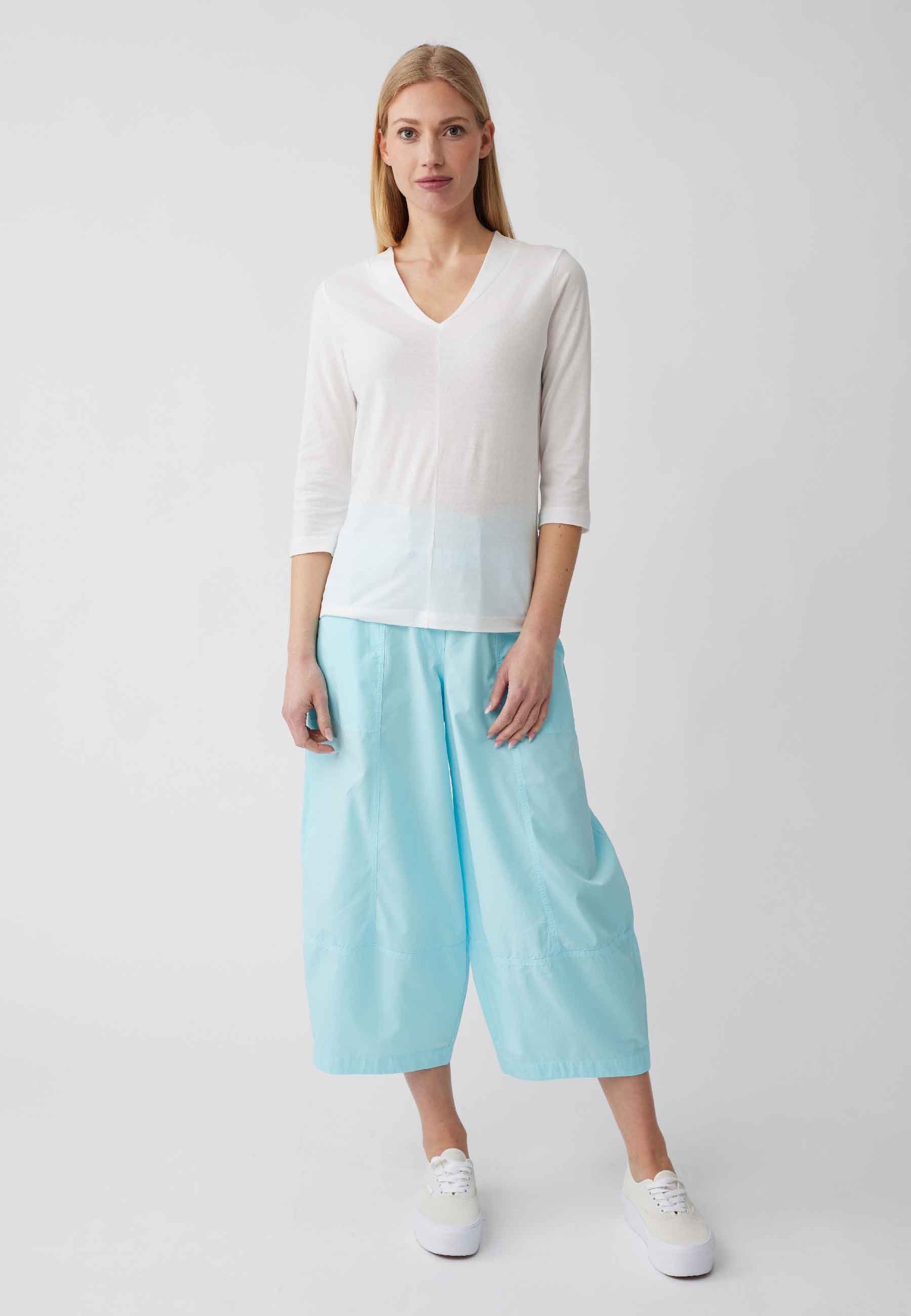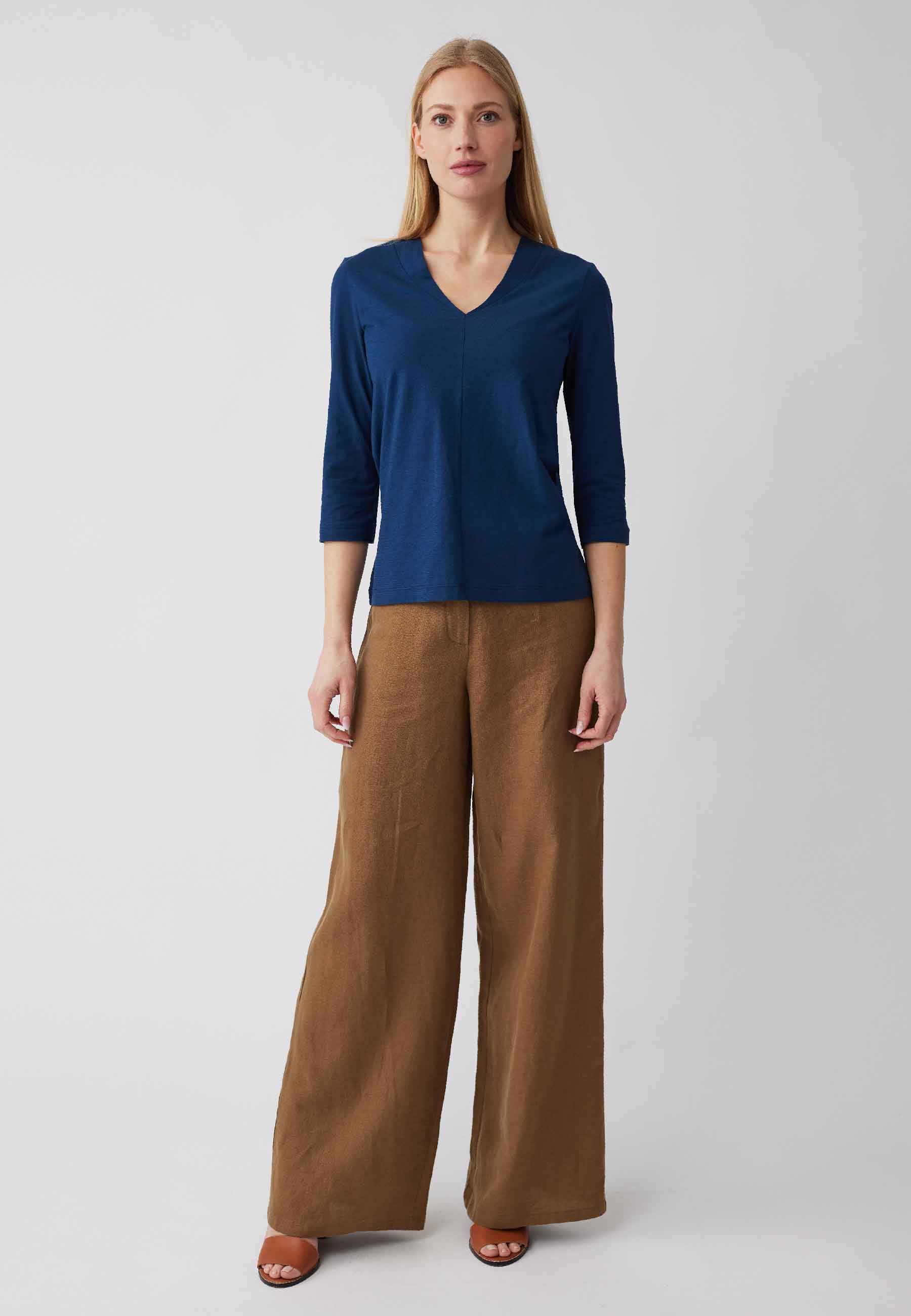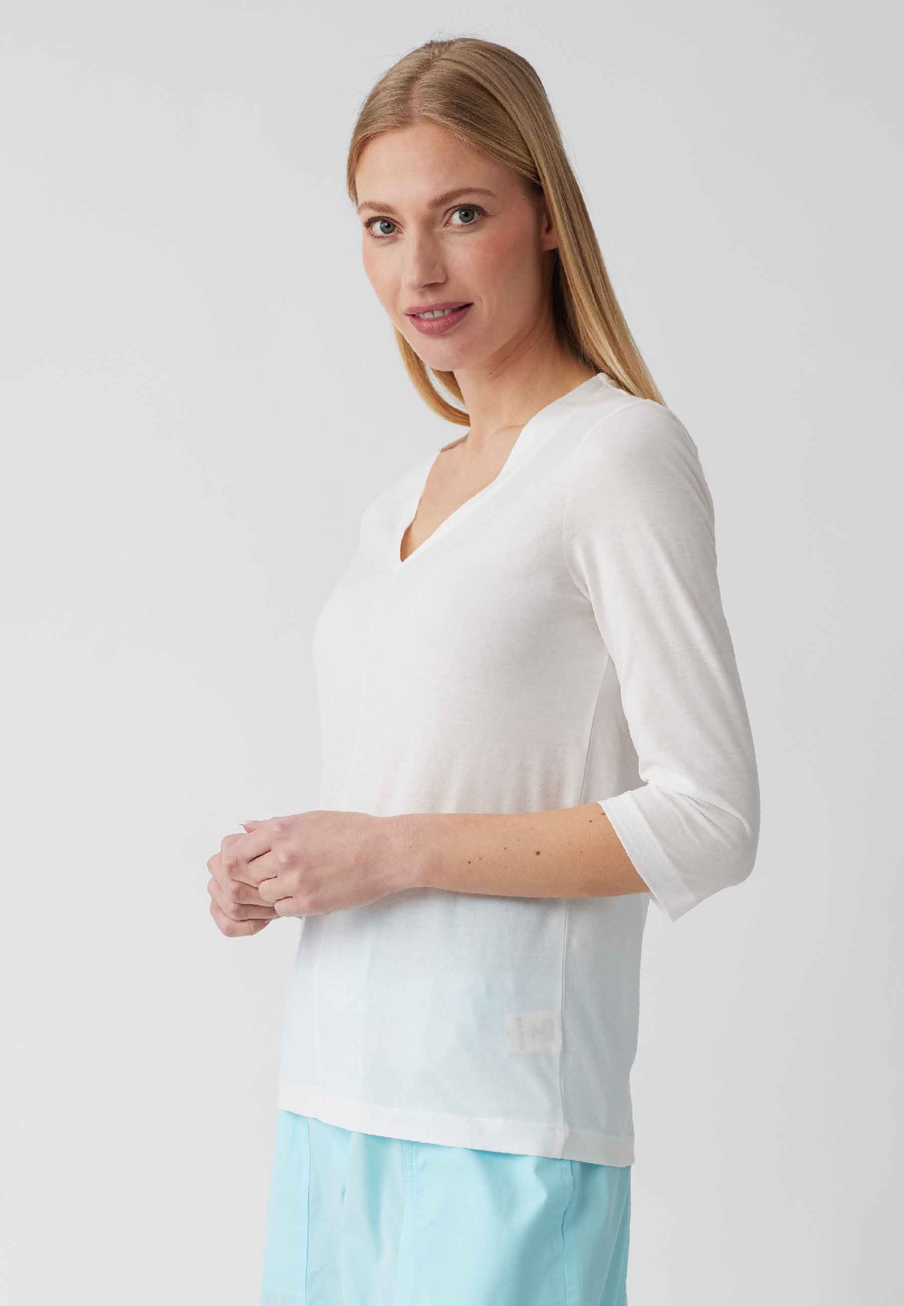 Shirt ALMILA aus leichter Bio-Baumwolle besticht durch seinen Außergewöhnlichen V-Ausschnitt, der fast schon die Anmutung eines kleinen Kragens hat und im Vorderteil in eine streckende Naht übergeht. Eine schmale, körpernahe Passform und die ¾ langen Ärmel runden das Design perfekt ab.