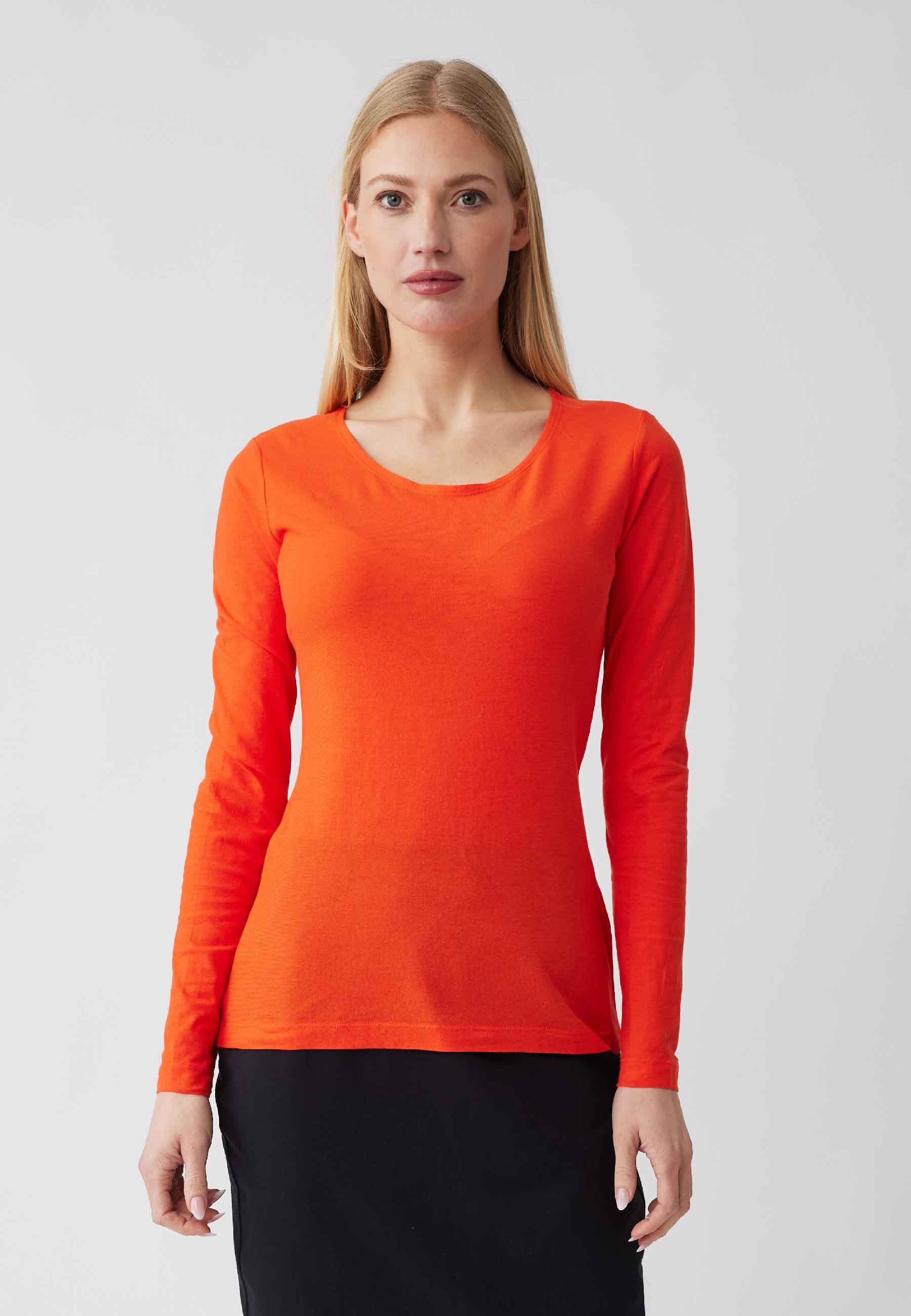 Ein schlichtes Basic-Shirt aus leichter Bio-Baumwolle, das mit einem sorgfältig verarbeiteten Rundhalsausschnitt und schmaler Passform überzeugt. Als perfekte Ergänzung unter Jacken oder solo zu Hosen und Röcken bietet dieses Langarmshirt vielseitige Kombinationsmöglichkeiten.