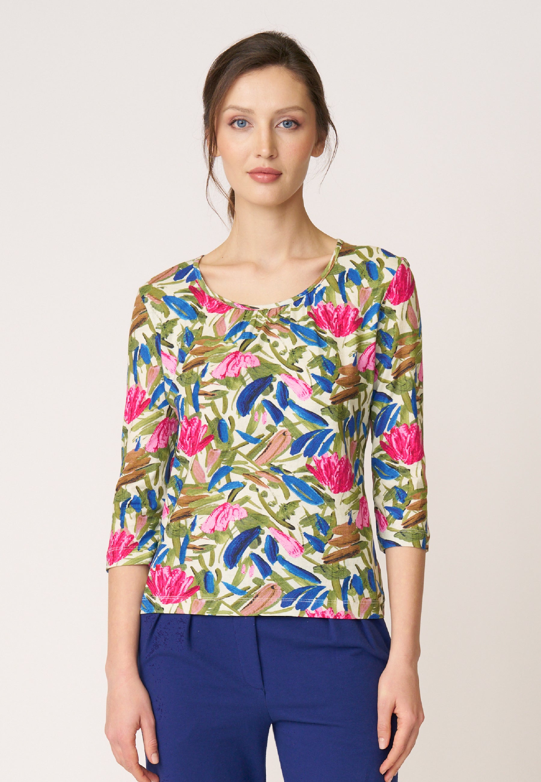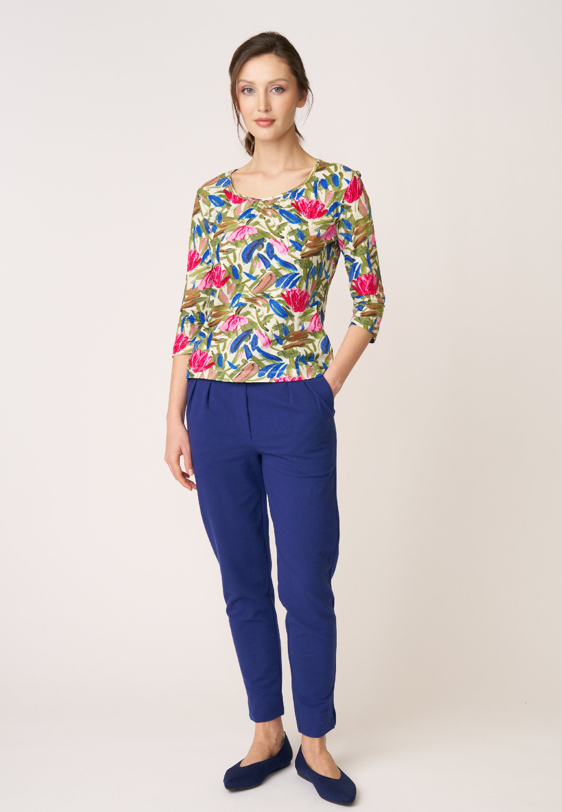 The "Delia" blouse shirt from LANA Organic combines summery lightness with sustainable quality. Made from 100% certified organic cotton (GOTS), it features a loose fit with short sleeves and an elegant round neckline. The exclusive "Druck Donia" print adds a special touch.