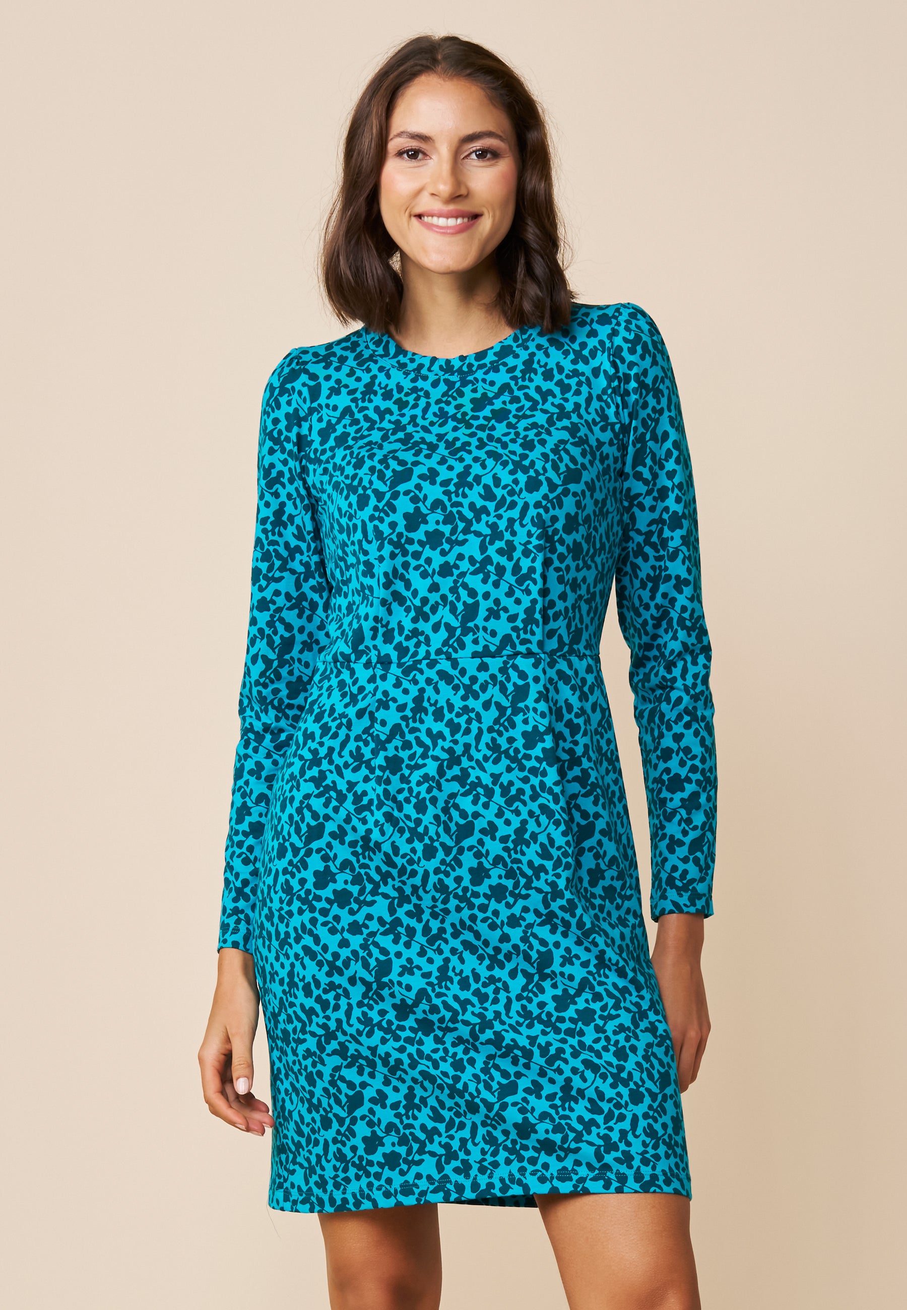Unser Kleid Kornelia ist ein figurbetontes Minikleid mit flachem Turtleneck. Die Taille wird geschmückt mit einer feinen Teilungsnaht und eingelegten Falten zum Rock und Oberteil. Somit bekommt man das nötige Volumen und behält dennoch die Vorzüge einer betonten Taille. Die leicht verkürzte Schulter wird durch einen früh einsetzenden Ärmel mit Raffung geschmückt. Das Kleid geht bis oberhalb des Knies und hat einen langen Ärmel.