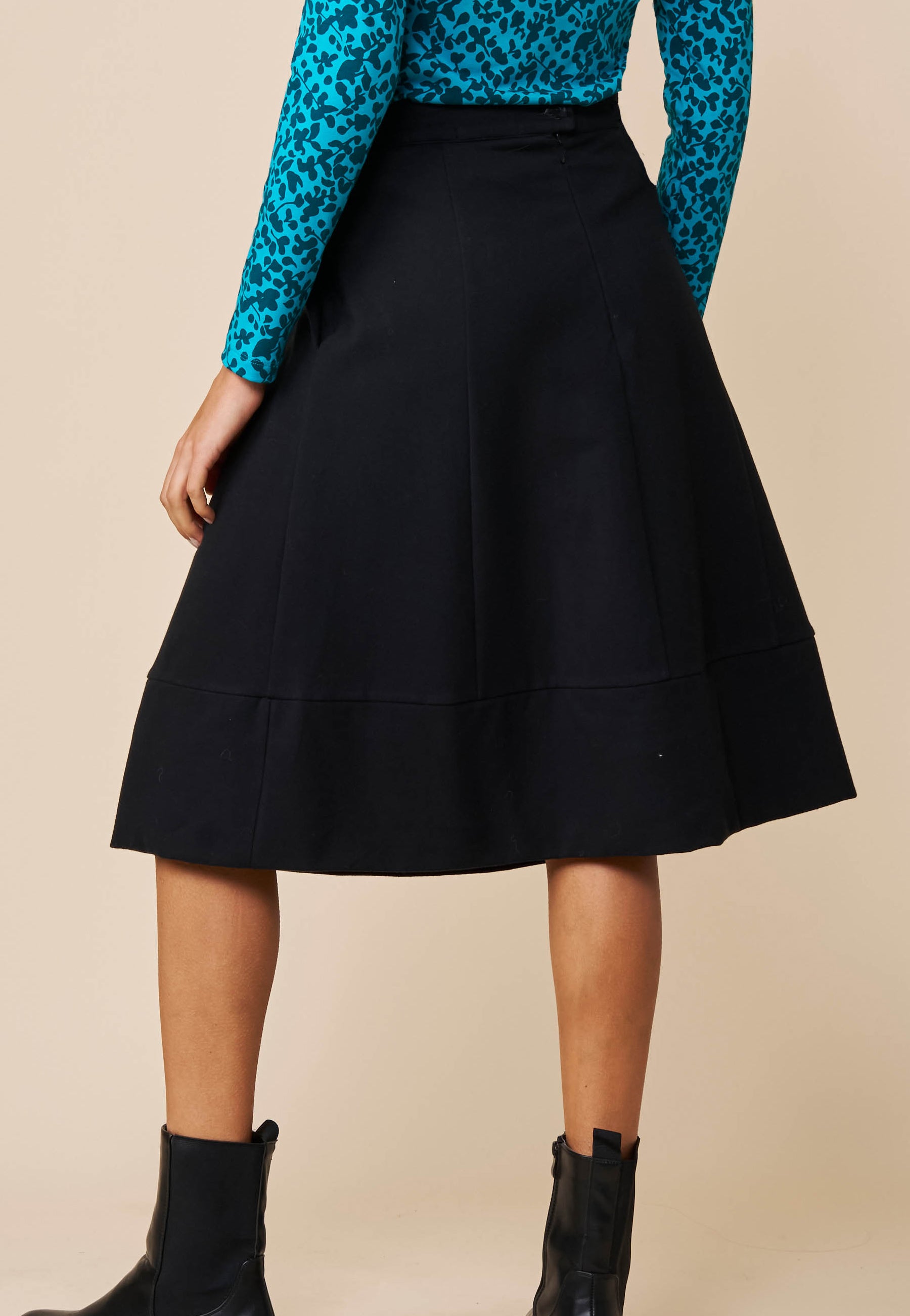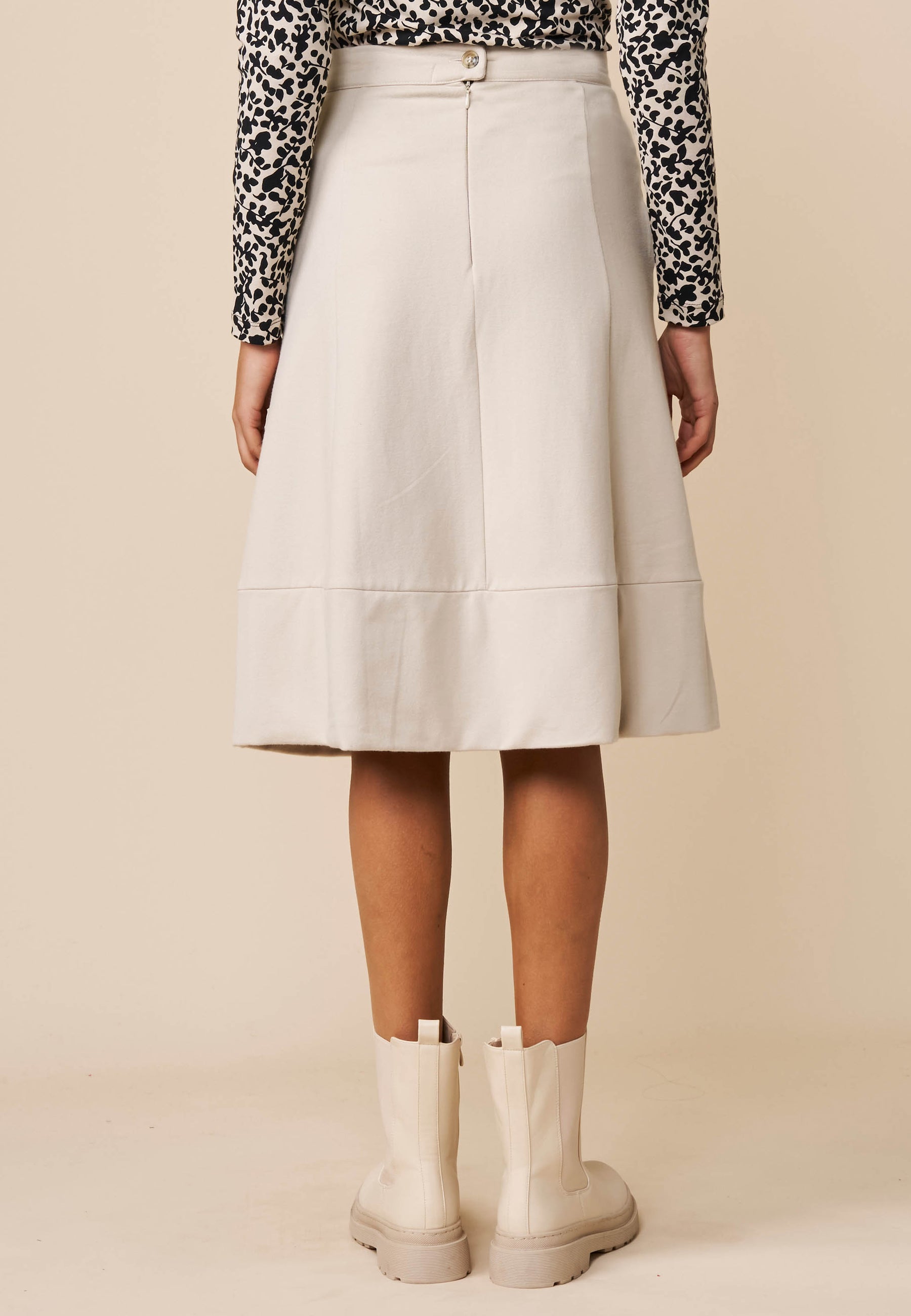 Ein knielanger Rock, der seine schöne Saumweite durch drei, in unterschiedlicher Höhe aufspringende, tiefe Kellerfalten im Vorderteil erhält. Geschlossen wird er in den hinteren Mitte mit einem Knopf und Reißverschluss. Die breite, doppelt gelegte Saumblende, Iässt das Rockvolumen voller und eleganter fallen.