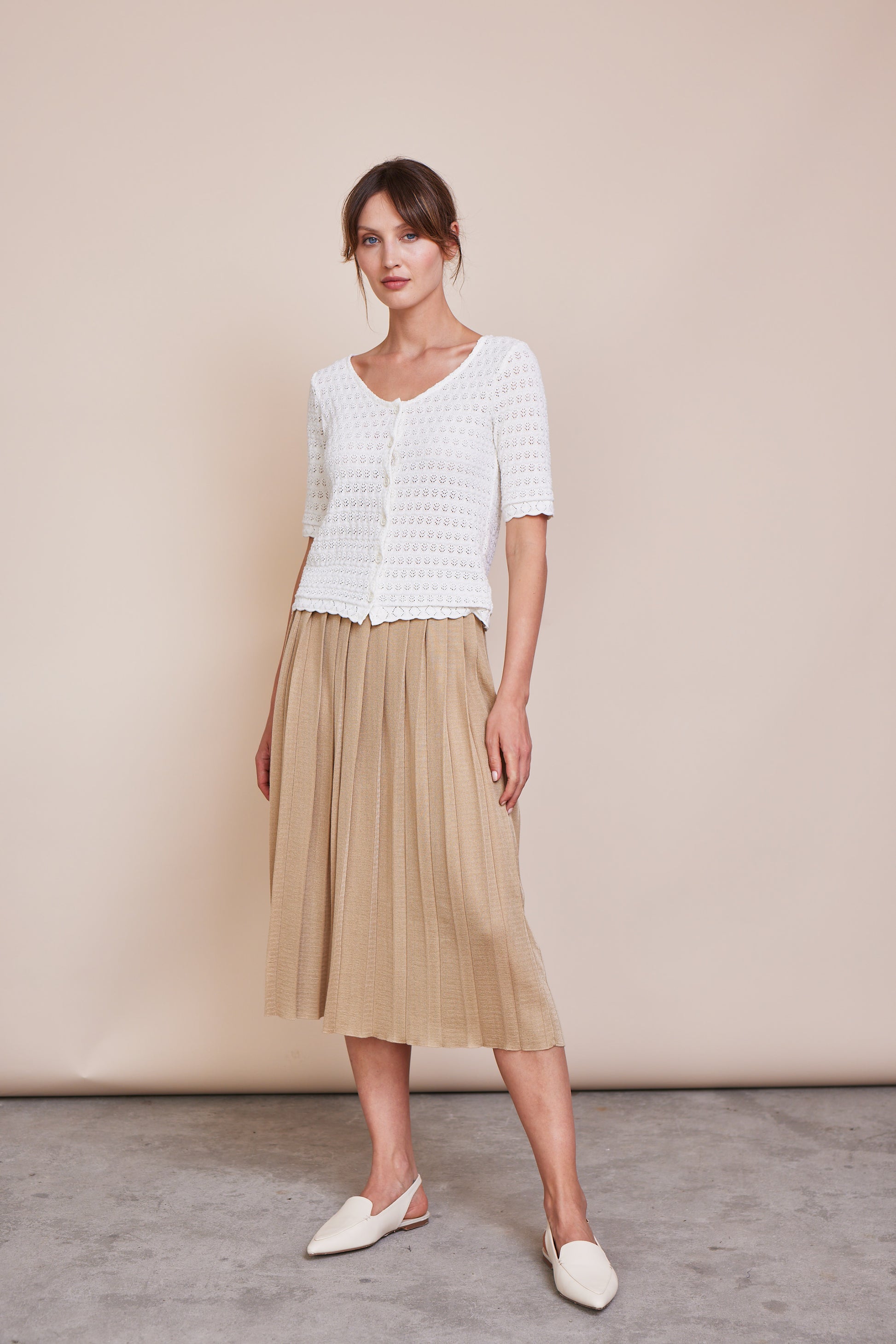 Die midilange Silhouette mit schwingender Saumweite und elastischem Taillenbund macht Dajana vielseitig kombinierbar – ob mit Shirt und Sneaker im Alltag oder mit Bluse und Sandalen für einen femininen Look. Die GOTS-Zertifizierung garantiert, dass der Rock nach strengen ökologischen und sozialen Standards produziert wurde und steht für verantwortungsvolle nachhaltige Mode.