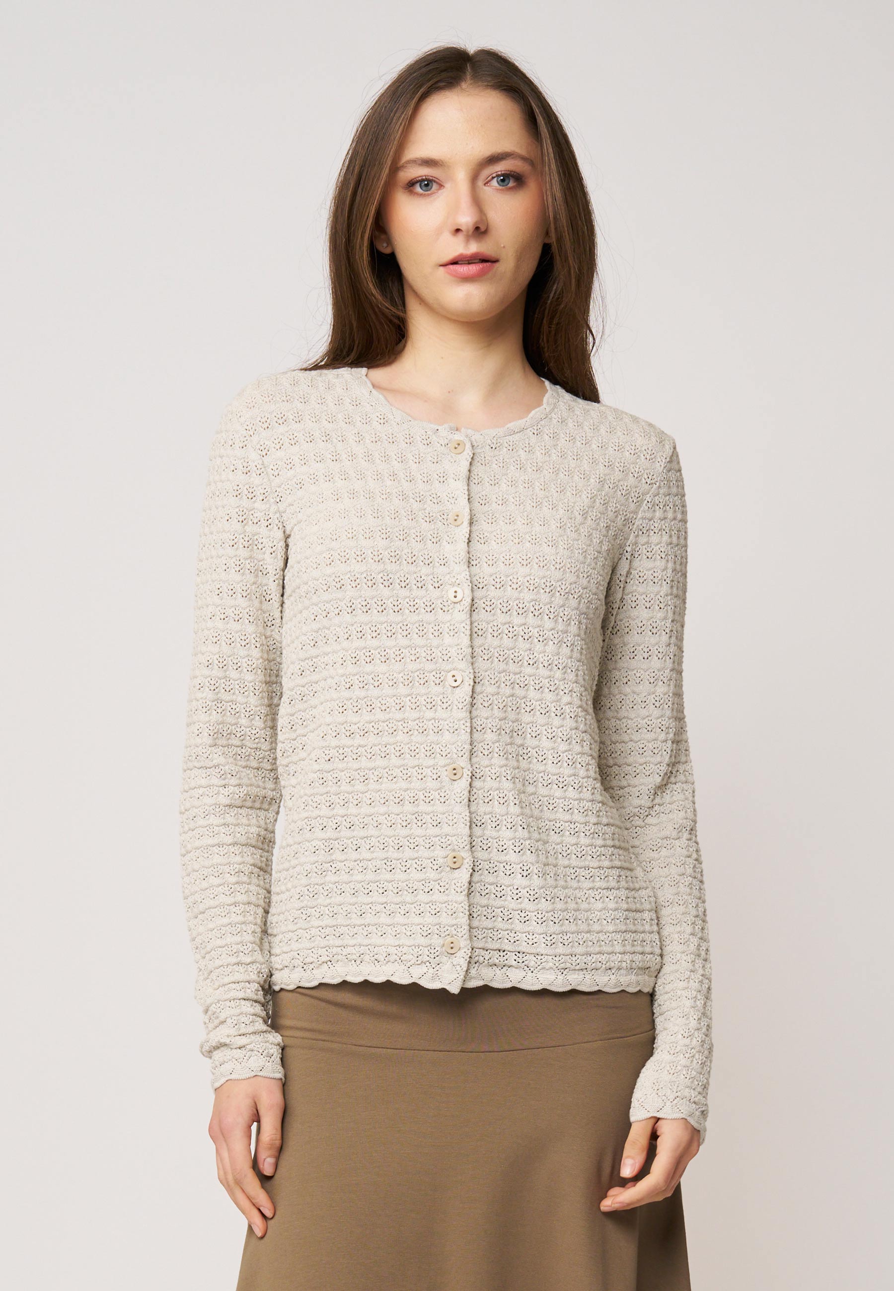 Unser MoDie Jacke Marcelina von LANA Organic ist eine leichte Strickjacke aus 100 % Bio‑Baumwolle, die elegante Schlichtheit mit sommerlicher Leichtigkeit verbindet. Das natürliche Material sorgt für angenehmen Tragekomfort und atmungsaktive Leichtigkeit – perfekt für milde Sommertage oder abends.