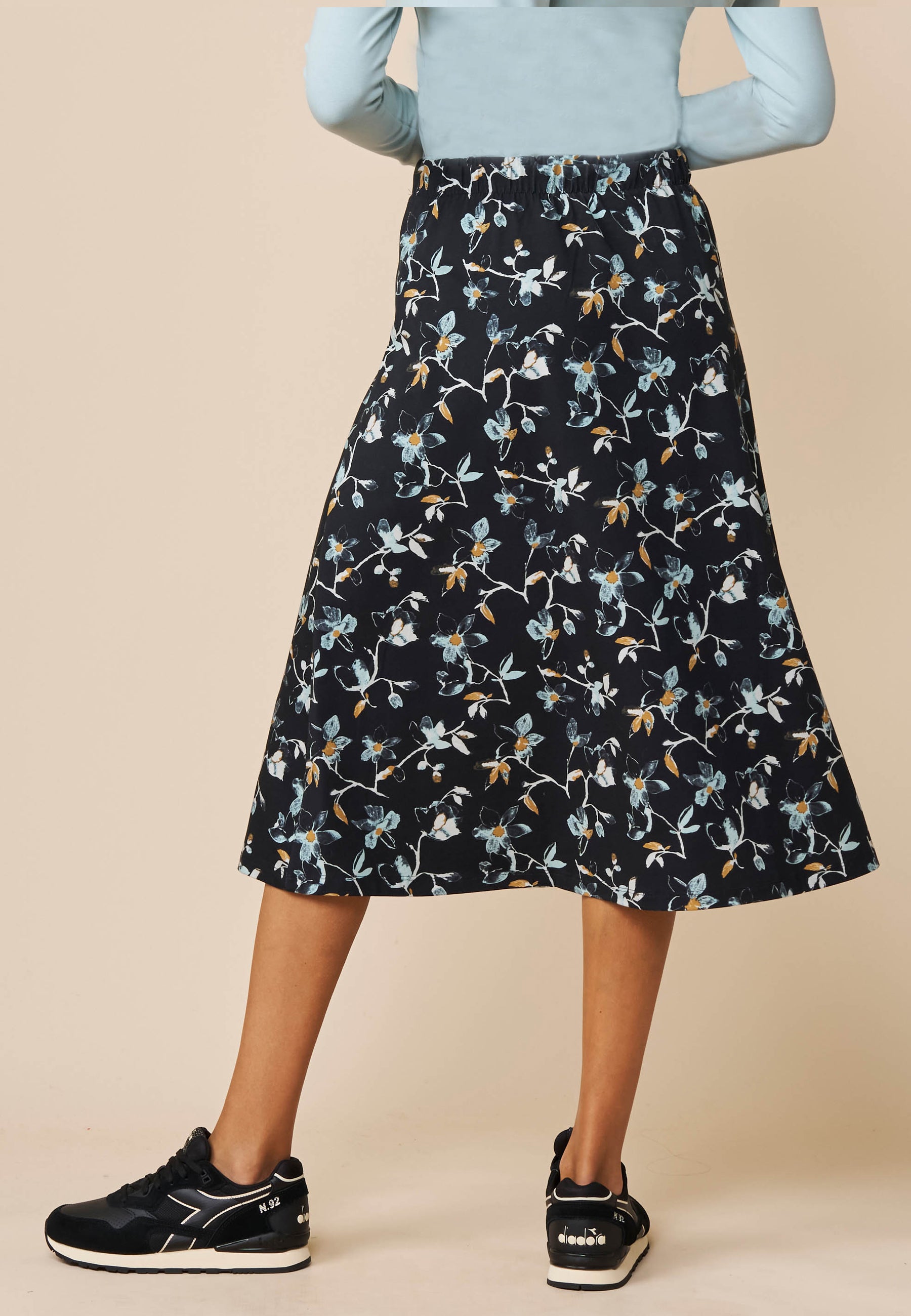 Ein knieumspielender Rock in A-Linie, der jede Bewegung mitmacht. Der breite, teilelastische Bund sorgt für eine gute und zugleich komfortable Passform. Ein Rock für viele Gelegenheiten!