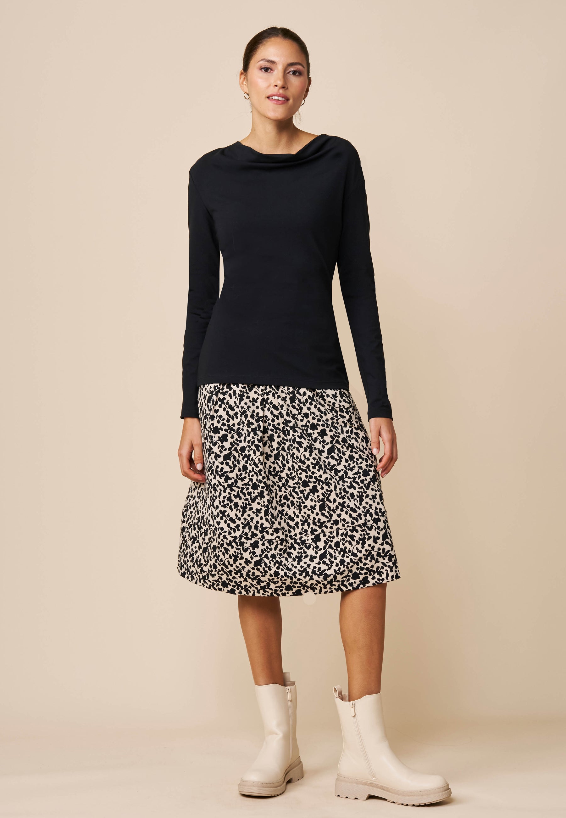 Ein schmal geschnittenes Langarmshirt aus weich falrender, hautangenehmer Baumwolle in kbA Qualität. Der Wassenfallausschnitt unterstreicht die feminine Seite und setzt elegante Akzente.
